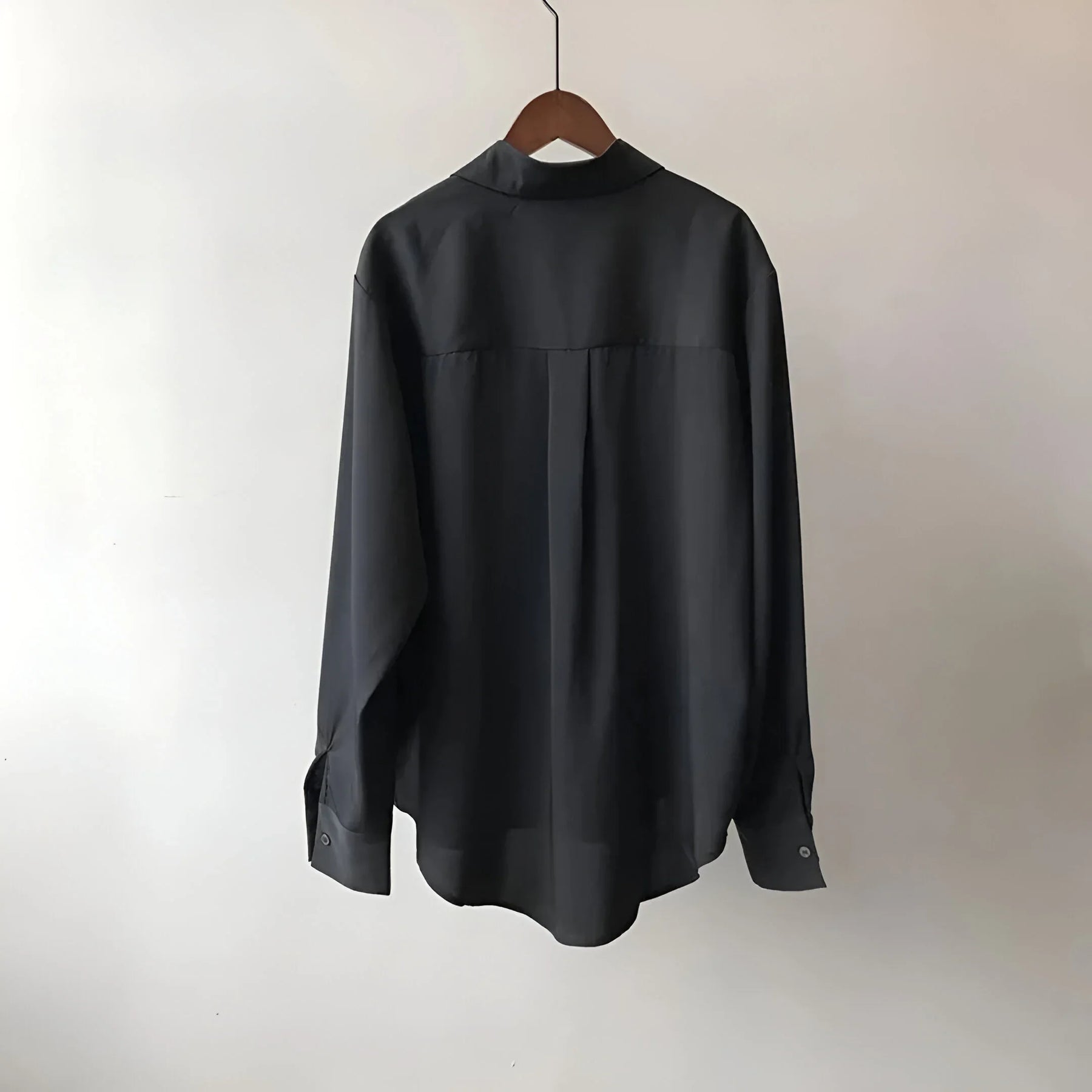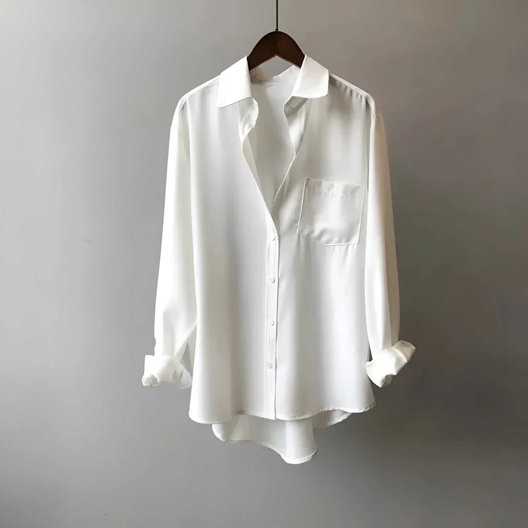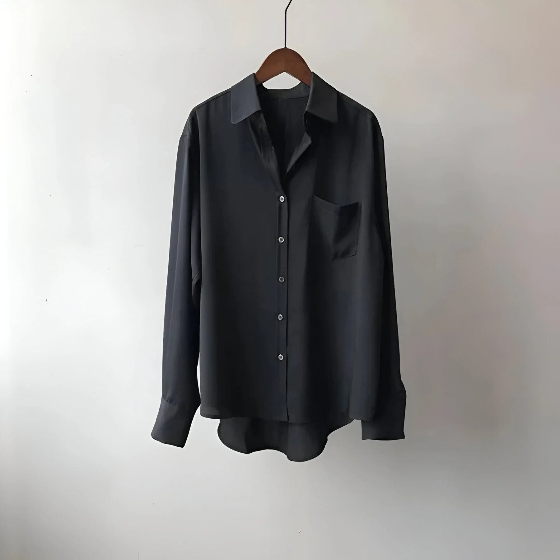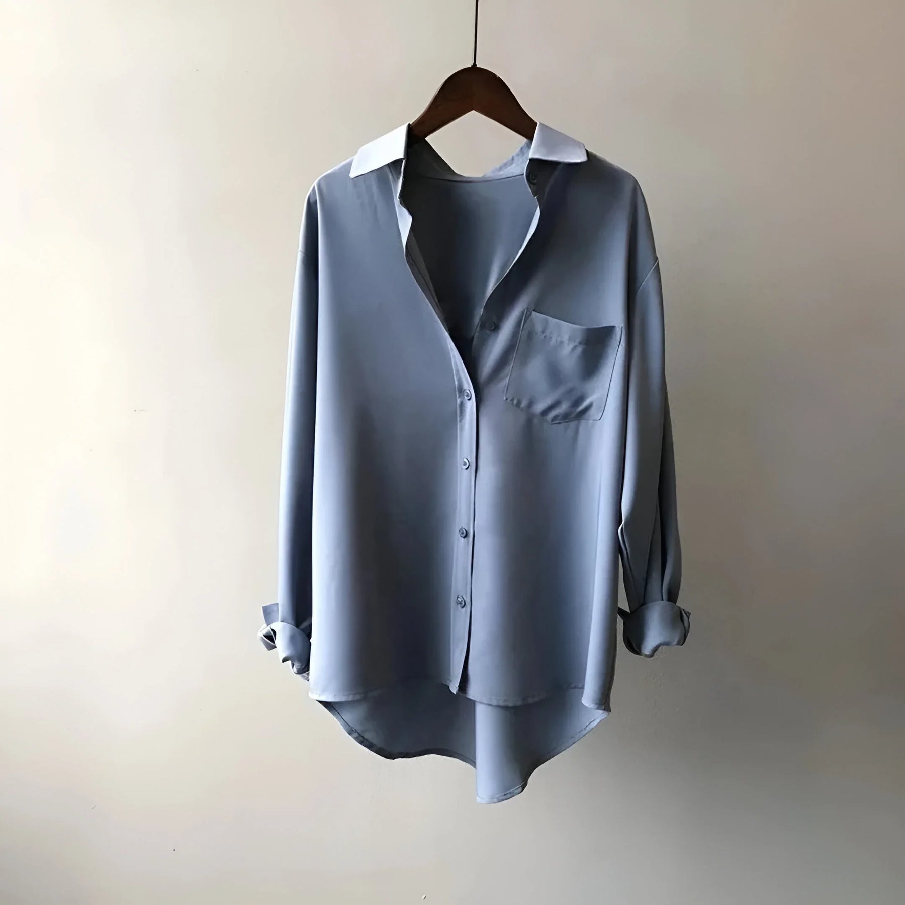 Smooth, lightweight fabric drapes softly and feels almost weightless. The relaxed cut, dropped shoulders, and single chest pocket create an easy, laid-back shape. A longer back hem lets the shirt move freely as you walk.