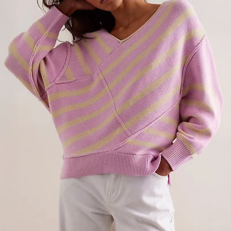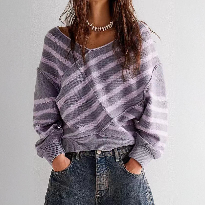 This sweater combines bold diagonal stripes with a relaxed off-shoulder neckline for a modern, effortless look. Crafted from soft knit fabric, it offers all-day comfort, while the ribbed hem and cuffs add a polished finish.