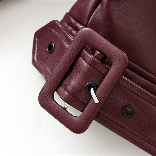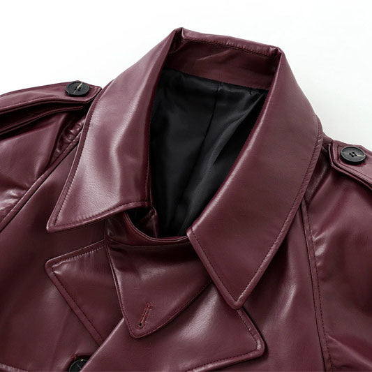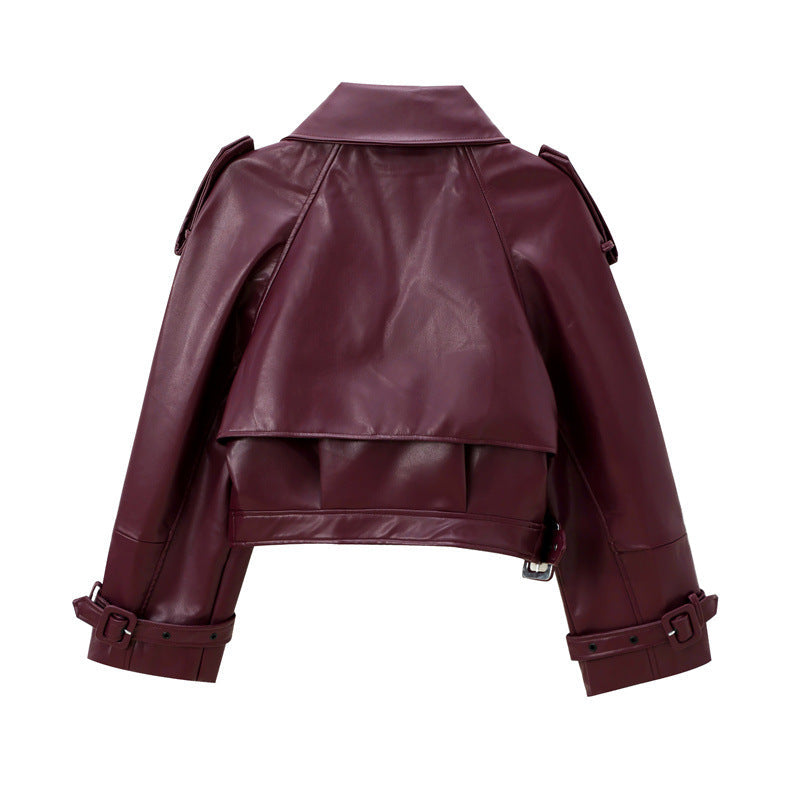 Sleek leather. Strong structure. This cropped double-breasted jacket is built to command attention with bold epaulette shoulders, sharp lapels, and adjustable belted cuffs. The deep Bordeaux hue enhances the striking silhouette, while a fully lined interior ensures effortless wear.