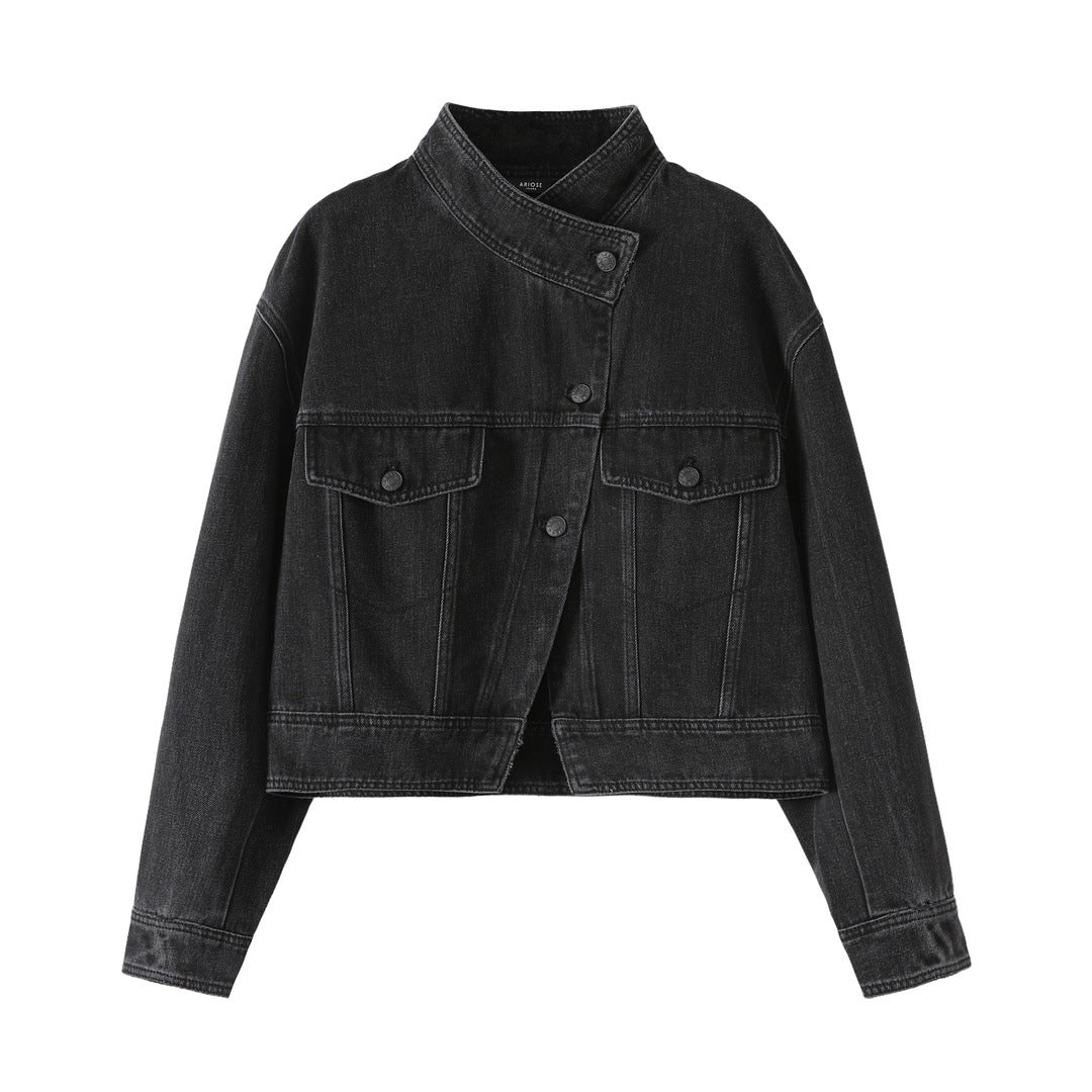 Clean lines and a structured high-neck collar define this modern denim jacket. The asymmetrical snap-button closure and cropped length create a sharp, contemporary silhouette.