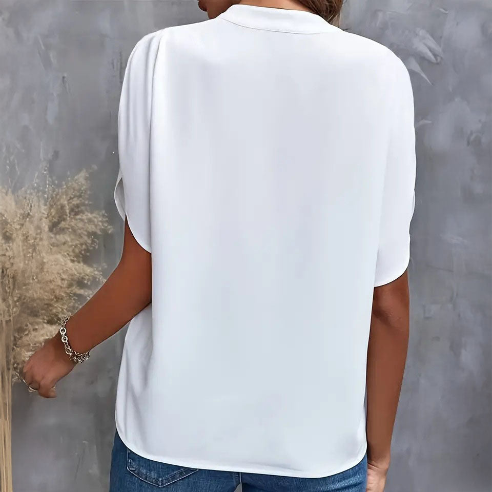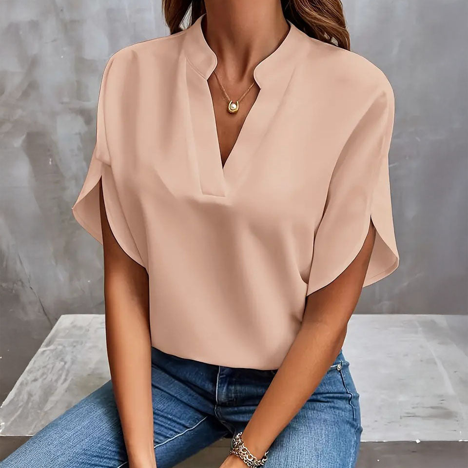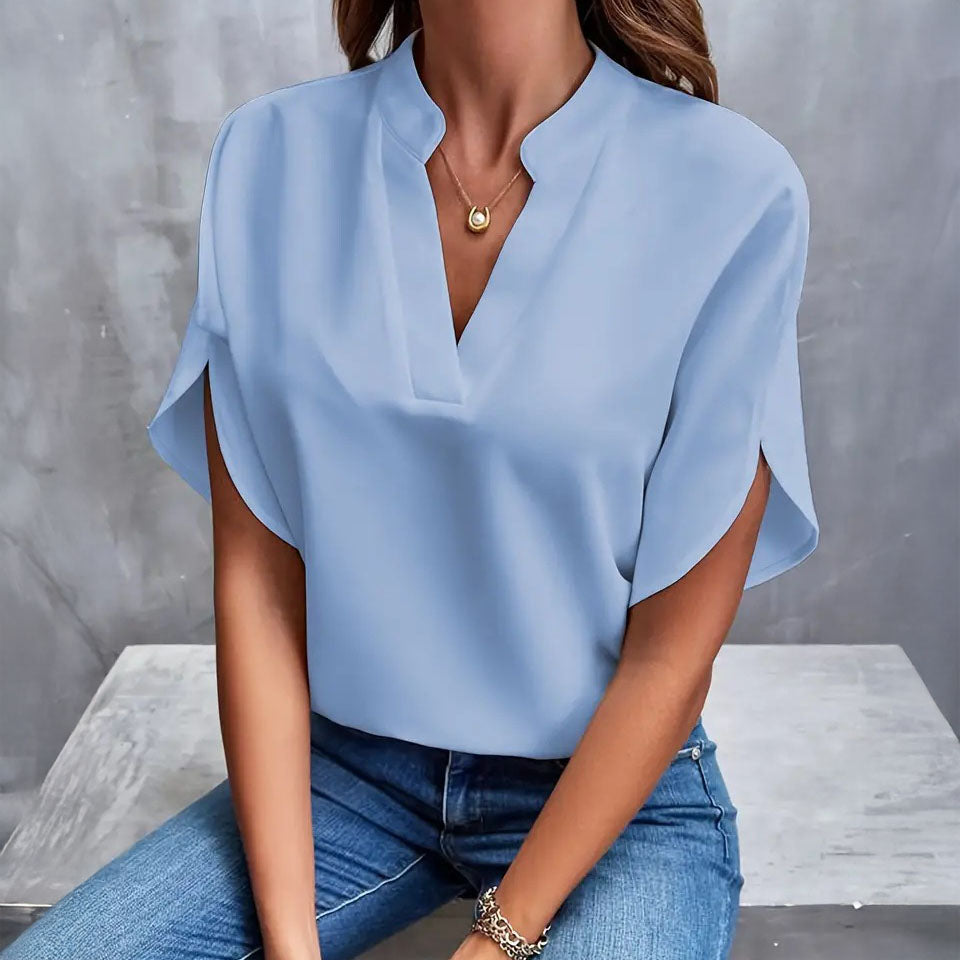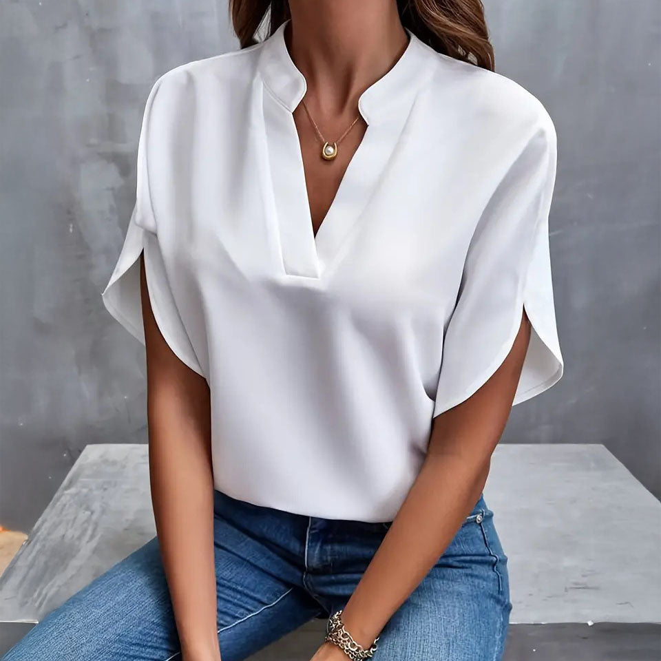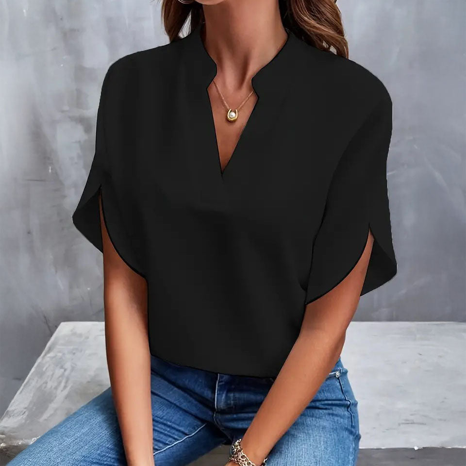 Fluid crepe falls in a clean drape from a structured V-notch collar, landing in a relaxed silhouette that skims the body. Split tulip sleeves and a curved hem keep movement easy, giving the blouse range from desk to drinks.