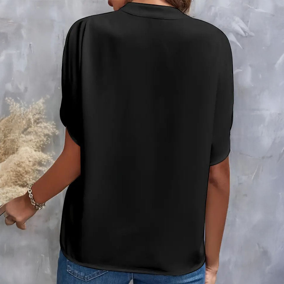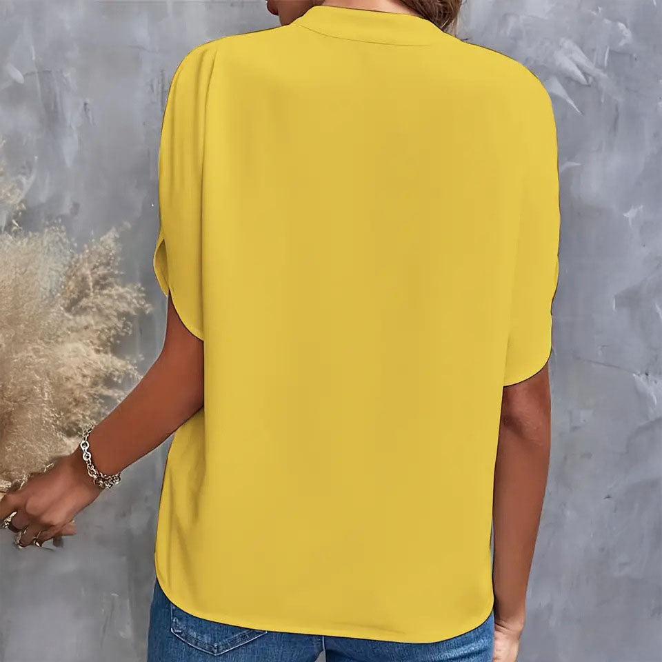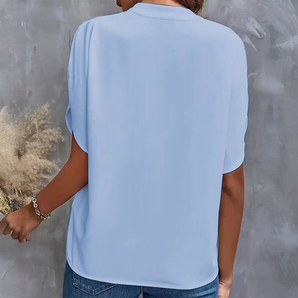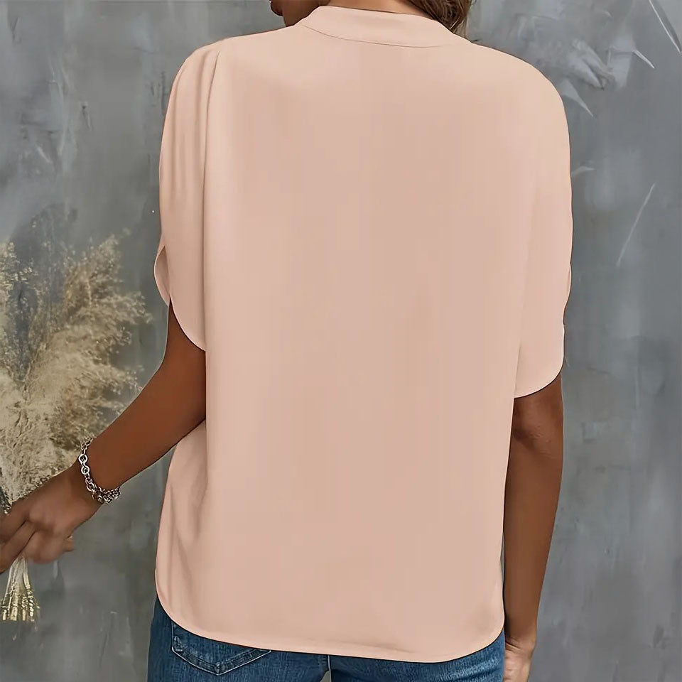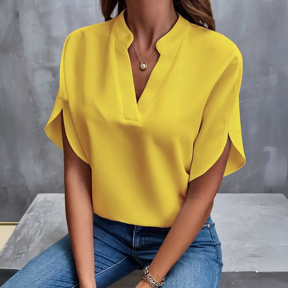Fluid crepe falls in a clean drape from a structured V-notch collar, landing in a relaxed silhouette that skims the body. Split tulip sleeves and a curved hem keep movement easy, giving the blouse range from desk to drinks.